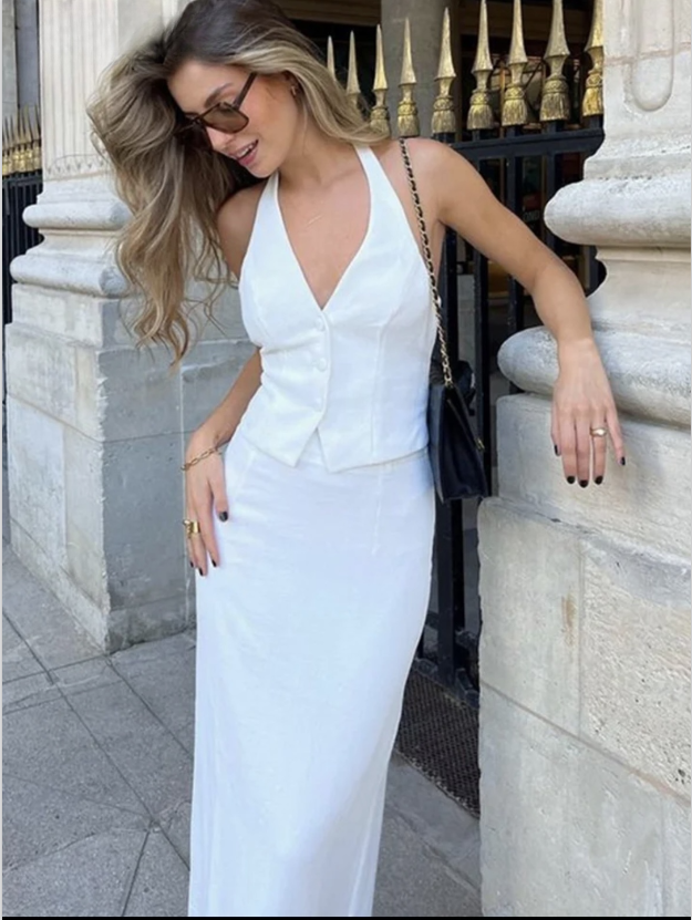 Dieses Set, bestehend aus einem weißen Gilet und einem weißen Maxirock, strahlt zeitlose Eleganz und Raffinesse aus und ist perfekt für warme Frühlingstage und schwüle Sommerabende. Die weiße Farbe sowohl des Gilets als auch des Rocks verleiht ein frisches und luftiges Gefühl und verleiht Ihnen sofort ein Gefühl von Raffinesse und Stil.