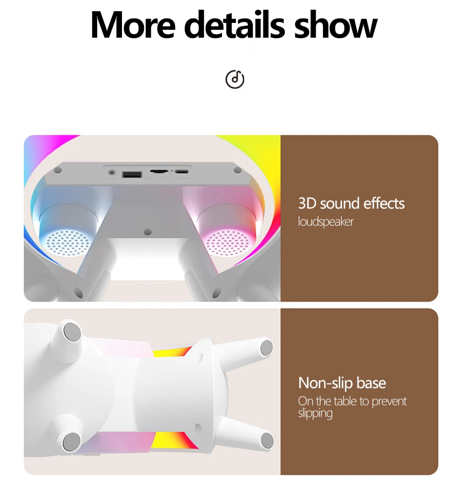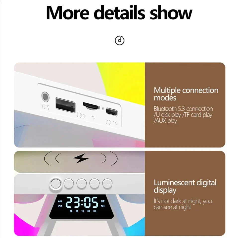 Die LichtSound Deluxe Lampe ist nicht nur eine gewöhnliche Nachttischlampe, sondern ein multifunktionales Gerät. Mit 6 dynamischen Lichtmodi und einer kabellosen Ladefunktion ist sie perfekt für jede Stimmung und jeden Anlass. Die fortschrittliche BT5.3-Technologie gewährleistet eine stabile Verbindung, sodass Sie Ihre Musik ohne Unterbrechungen genießen können.