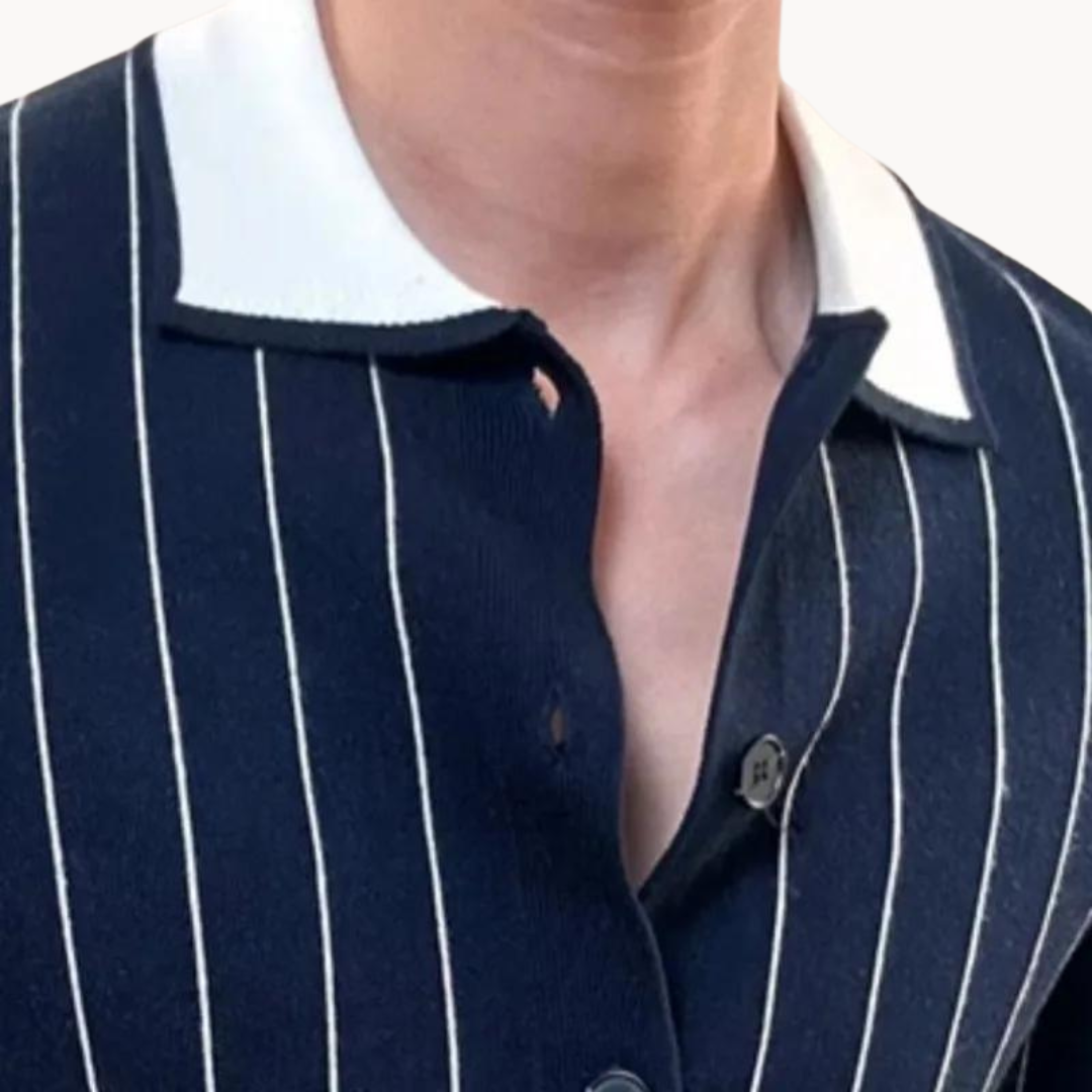 Dieser Pullover kombiniert einen klassischen Streifenlook mit modernen Akzenten und vereint Komfort mit Stil. Der elegante Umlegekragen und der einreihige Verschluss verleihen dem Design eine raffinierte Note. Mit seinen langen Ärmeln und der sorgfältig gestrickten Konstruktion ist dieser vielseitige Pullover perfekt für jedes Layering im ganzen Jahr. Ein echtes Highlight, das Ihrem Outfit eine elegante und anspruchsvolle Ausstrahlung verleiht.