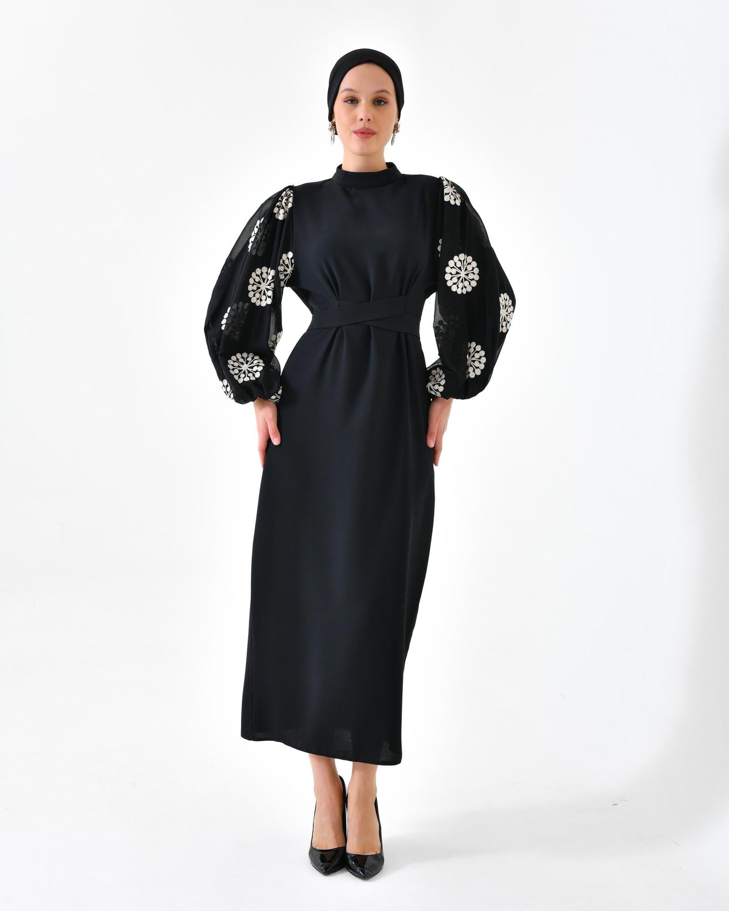 - Elegantes Design: Das Kleid besticht durch detaillierte Stickereien und Ballonärmel, die einen femininen, modernen Look verleihen.