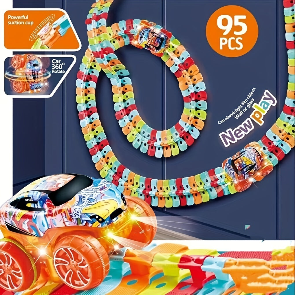 Tauchen Sie ein in ein einzigartiges Rennerlebnis! Holen Sie sich die bunte leuchtende hängbare Rennbahn mit elektrischen Schienenautos und erleben Sie grenzenlosen Spielspaß – alleine oder mit der ganzen Familie!