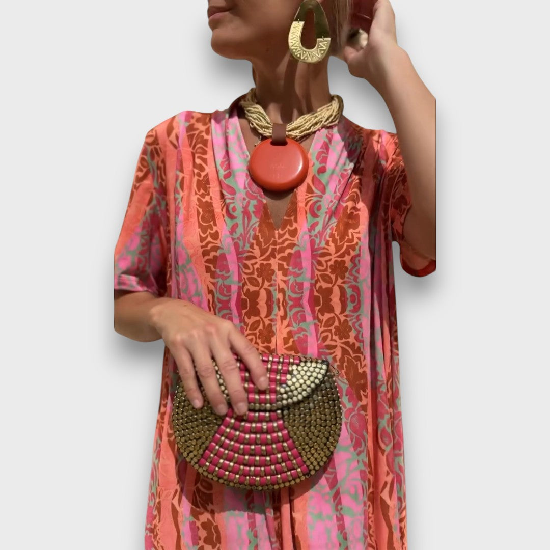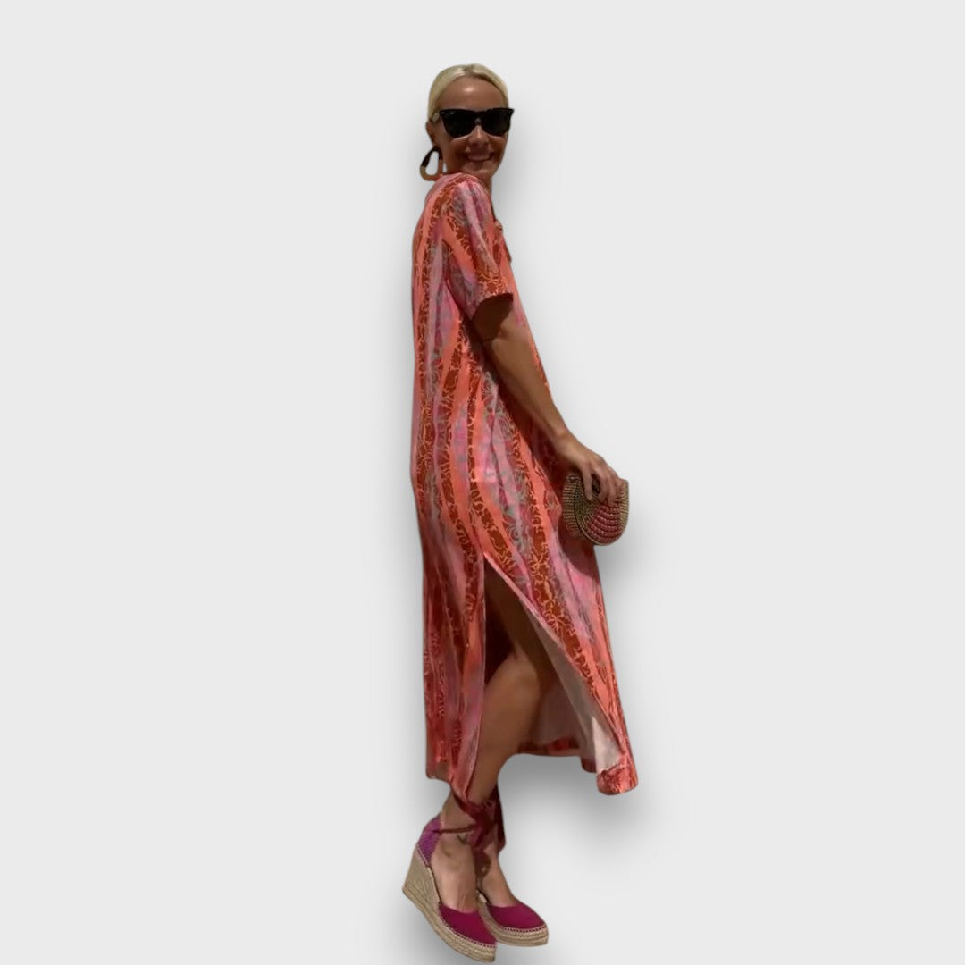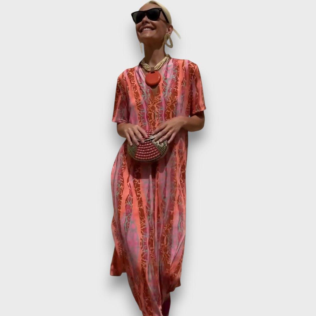 Cortana fängt die Energie des Sommers in lebendigen Farben und fließender Form ein. Das Maxikleid mit seinem ausdrucksstarken Muster in Korall- und Pinktönen umschmeichelt die Figur und bewegt sich sanft mit jedem Schritt. Der gerade Schnitt sorgt für Leichtigkeit, während der elegante Rundhalsausschnitt und kurze Ärmel den Look harmonisch abrunden – perfekt für warme Tage, an denen Stil und Unbeschwertheit zusammenkommen.