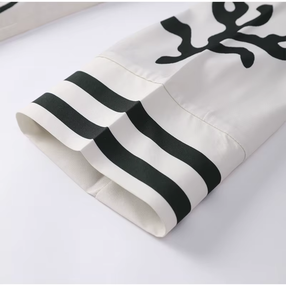 Der exklusive Schwarz-Weiß-Print verleiht dem Ensemble einen künstlerischen, avantgardistischen Touch. Dieses markante Design zieht alle Blicke auf sich und setzt ein starkes modisches Statement.