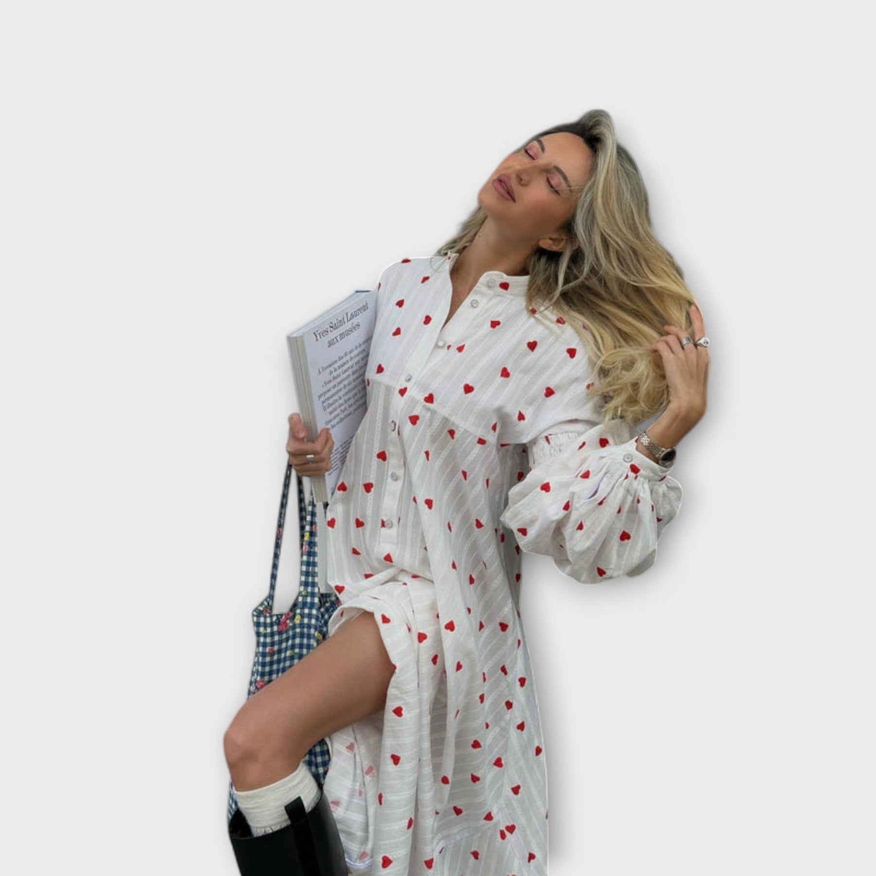 Elna ist wie ein Tag auf dem Land, voller Sonne, Leichtigkeit und romantischem Charme. Die feine Jacquard-Baumwolle mit roten Herzmotiven verleiht dem Kleid eine verspielte Eleganz, während die voluminösen Ballonärmel und der weit schwingende Rock eine feminine Silhouette zaubern. Vordere Knöpfe und ein weiches Baumwollfutter machen Elna zum stilvollen Begleiter für jeden Tag mit Gefühl.