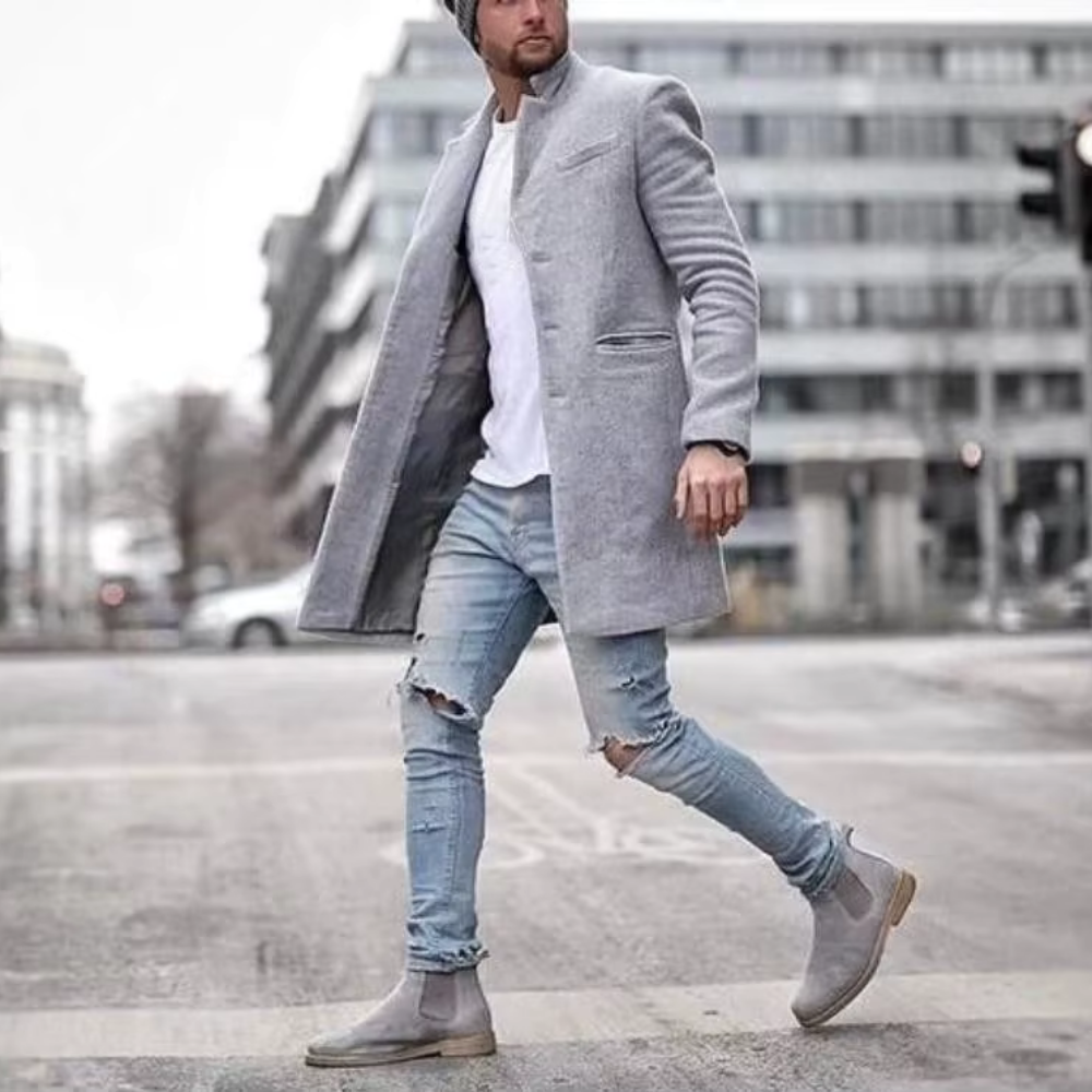 Der moderne Mantel mit Stehkragen und klarer Linienführung verleiht jedem Outfit einen souveränen Auftritt. Die schmale Passform und die platzsparenden Paspeltaschen runden das minimalistische Design ab.