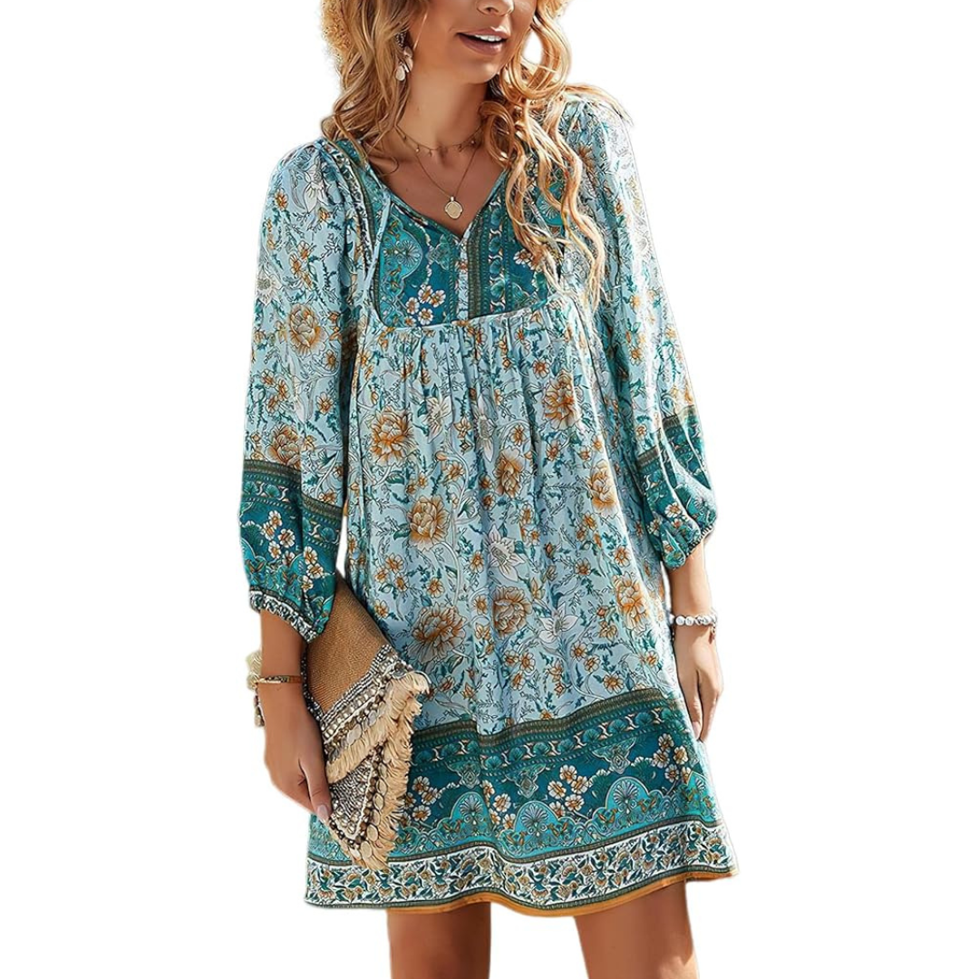 Bohemian-Chic-Stil: Das Fio-Kleid kombiniert eine lockere Passform mit einem Blumenmuster und V-Ausschnitt und kreiert so einen Bohemian-Chic-Suchen, der sowohl trendig als auch zeitlos ist.