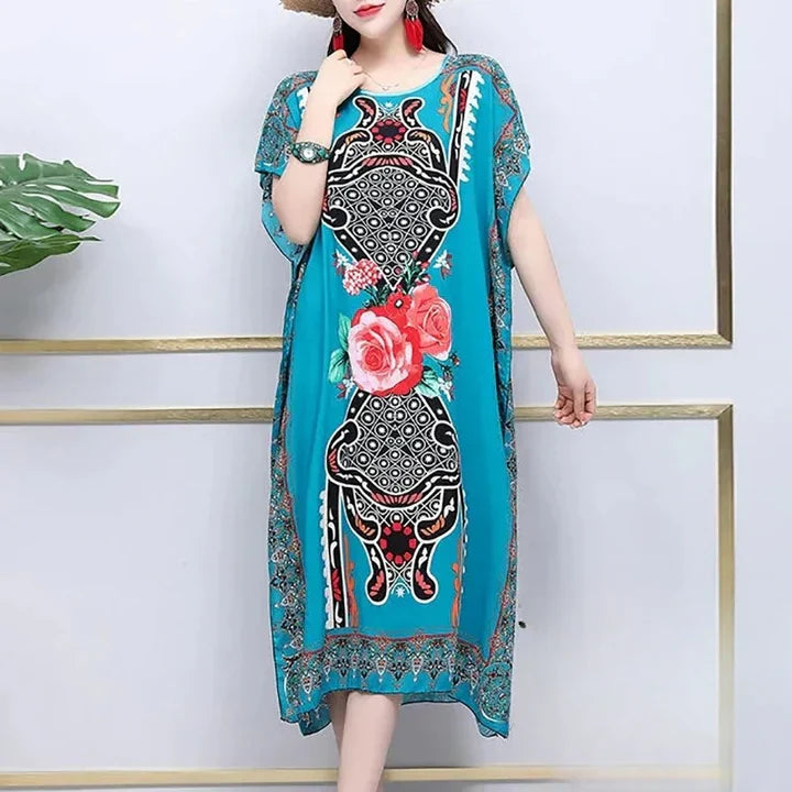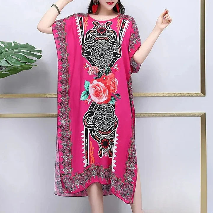 Dieses Kleid hat sich als Favorit unter vielen etabliert, und das aus gutem Grund! Erstens sorgt der weit schwingende Rock für eine dramatische Wirkung, die jeden Schritt zum Erlebnis macht. Zweitens, der zeitlose V-Ausschnitt verleiht Ihrem Look eine elegante Note. Drittens ist das auffällige Druckmuster ein echter Hingucker, der bewundernde Blicke auf sich zieht.