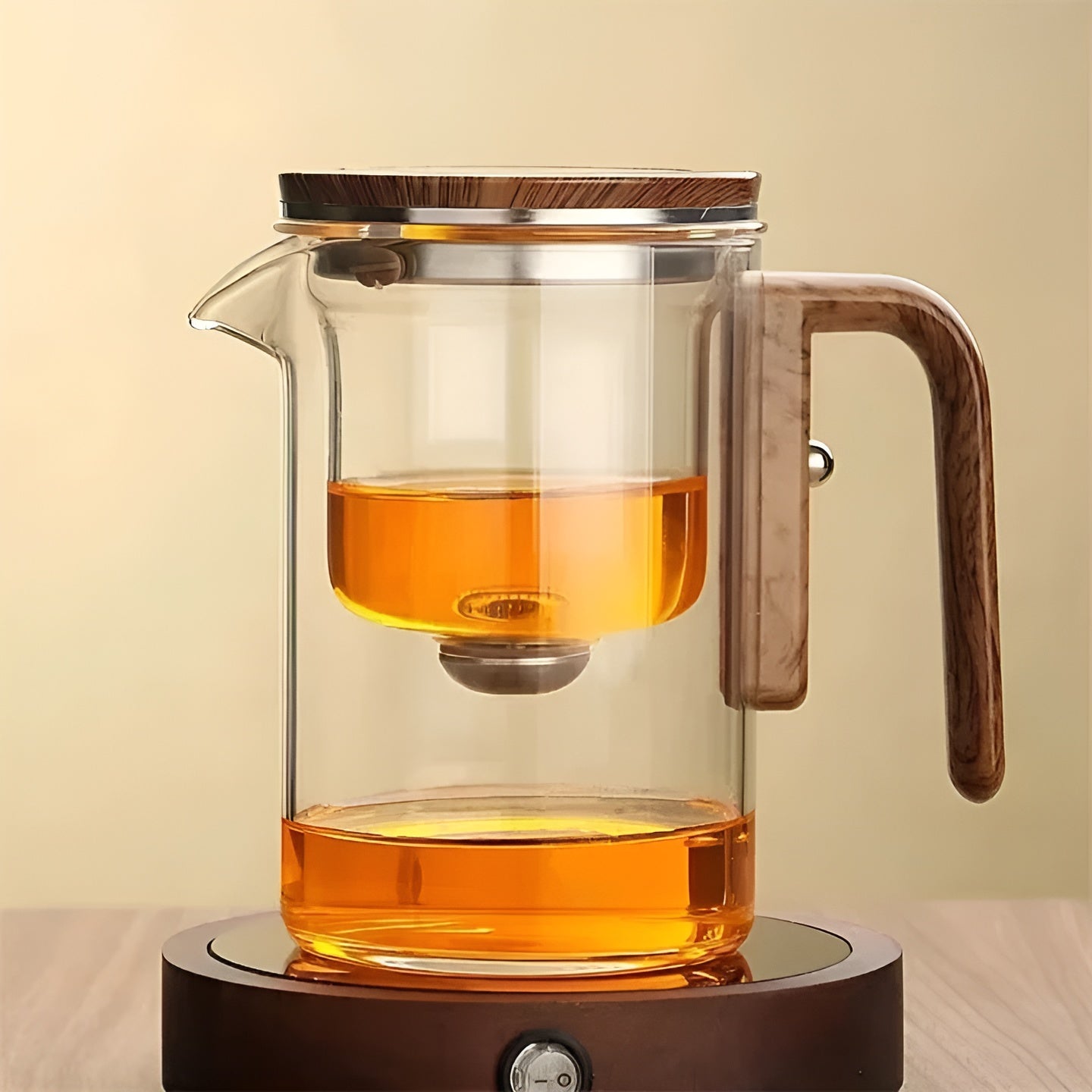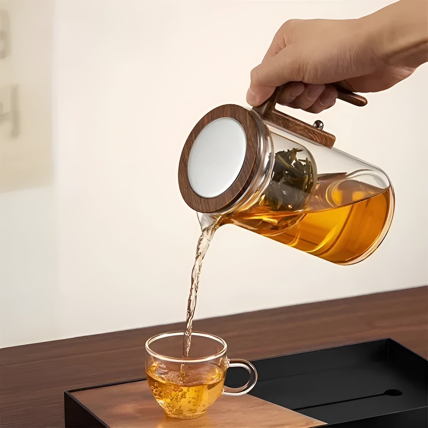Glasteekanne mit Holzgriff – Ein-Klick-Filter | Perfekt für losen Tee & Puer