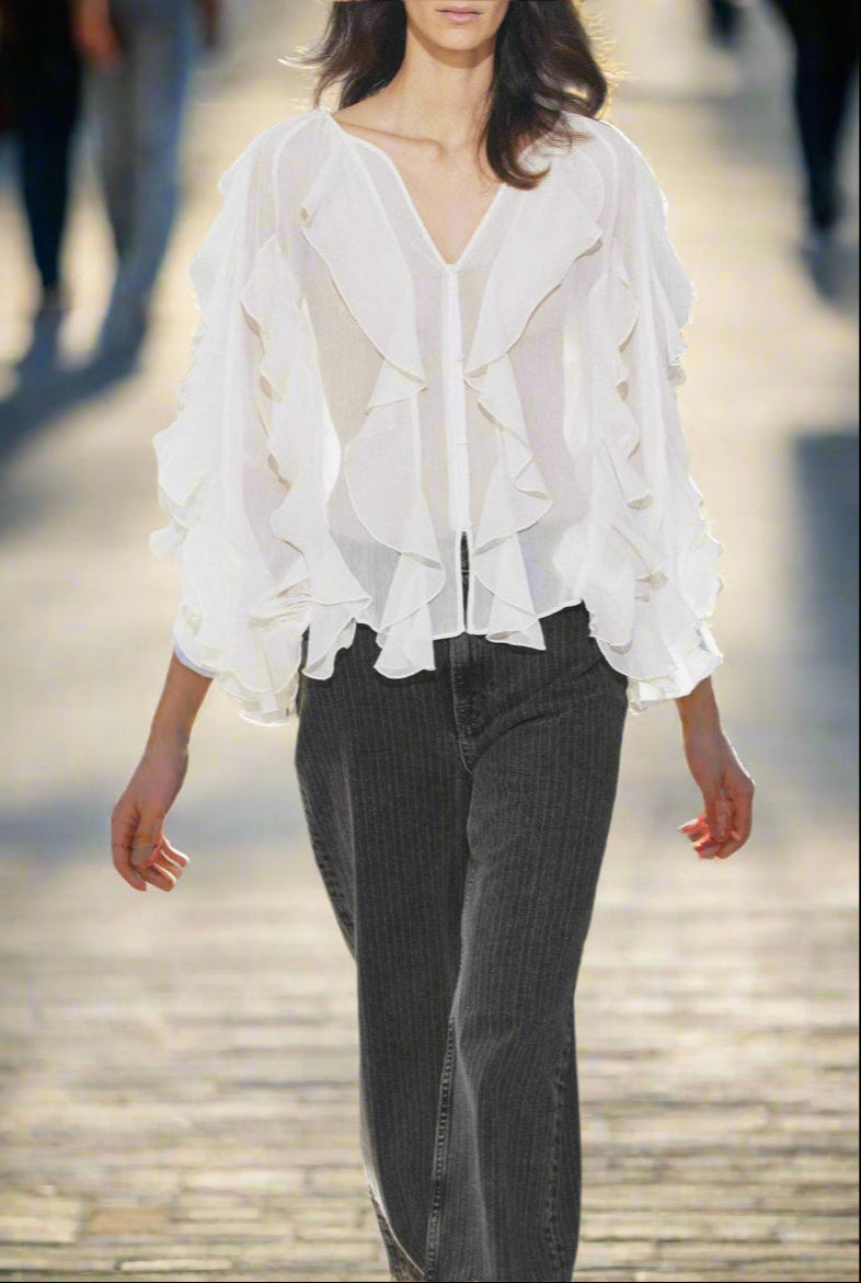 • Ausschnitt: Femininer V-Ausschnitt mit Rüschendetails