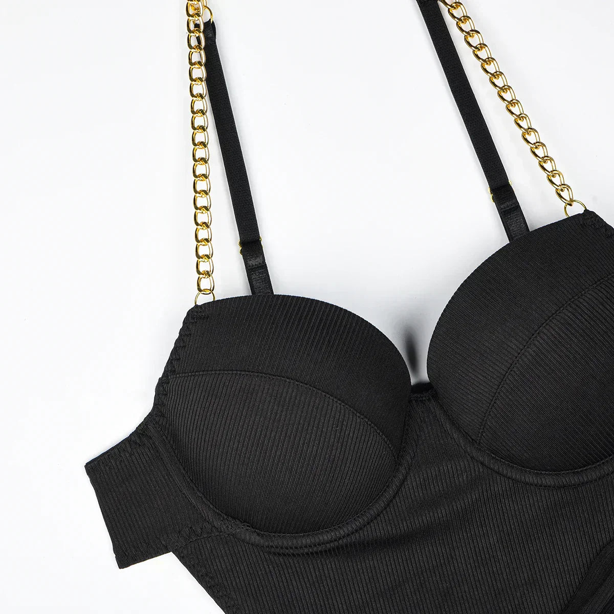 Lenas Body strahlt Klasse und Stärke aus. Mit klaren Linien, goldenen Ketten-Trägern und einer taillenbetonenden Schleife ist dieses Design sowohl elegant als auch sinnlich. Die perfekte Wahl für Frauen, die luxuriöse Schlichtheit mit einem verführerischen Twist lieben.