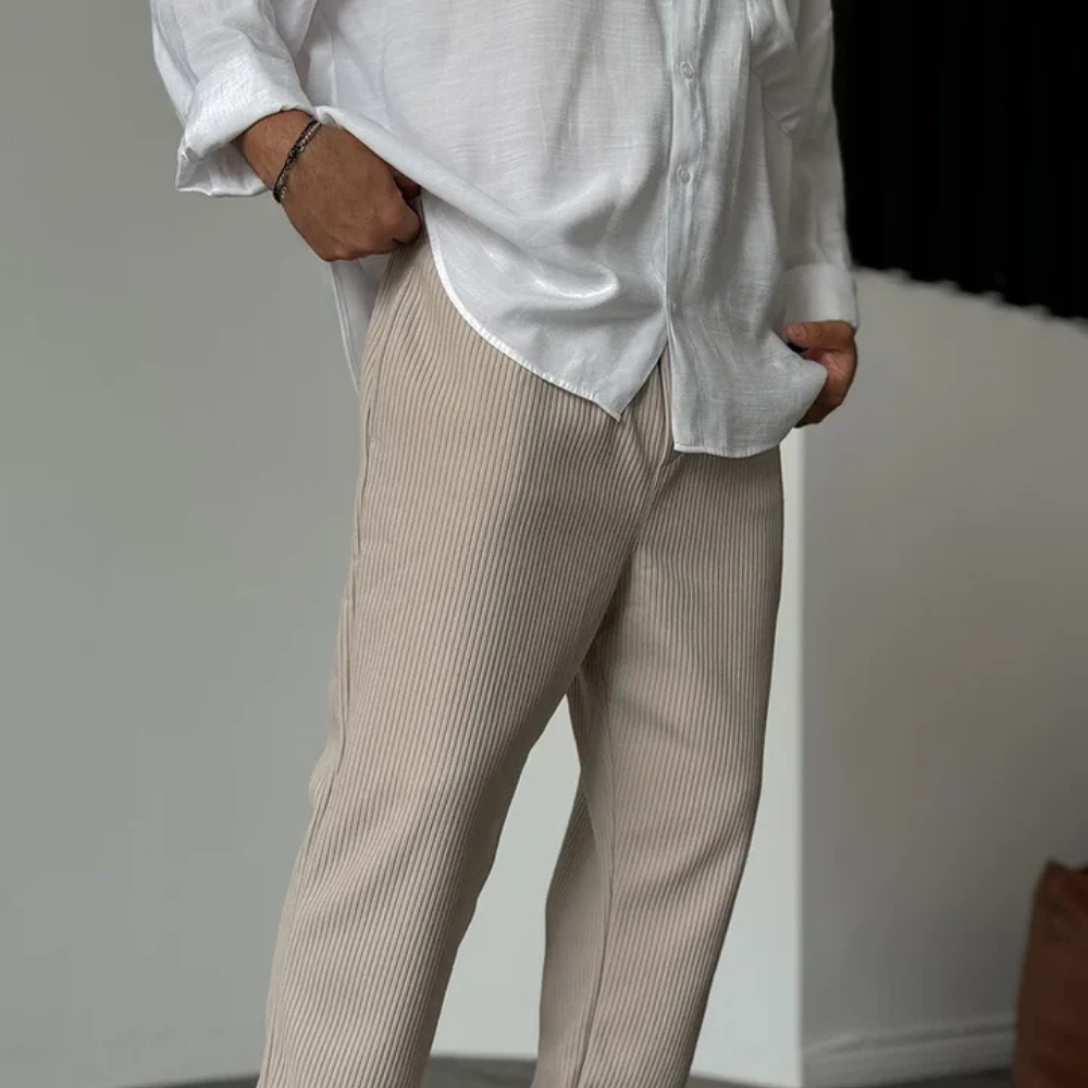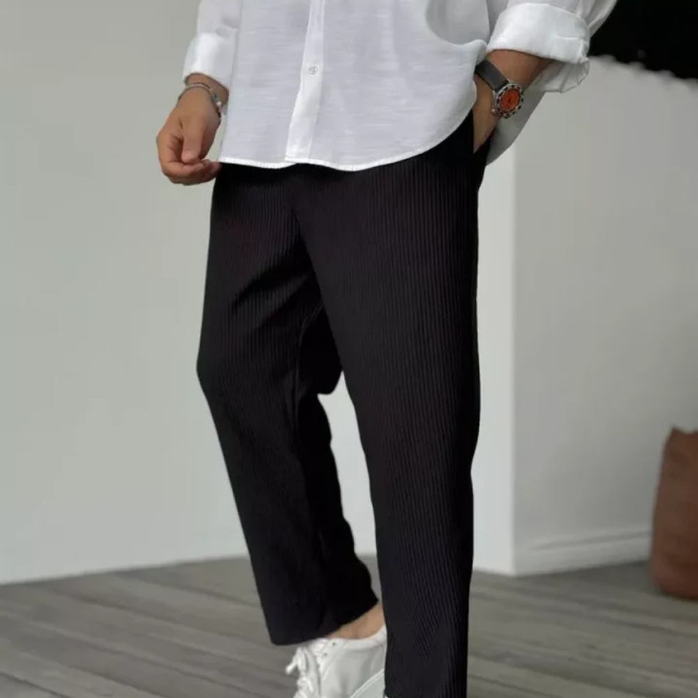 Der fließende Stoff fühlt sich angenehm weich an, bleibt dennoch formstabil und elegant. Die schlanke Passform unterstreicht eine klare Silhouette, während elastische Details und Bewegungsfreiheit für maximalen Komfort sorgen – ob unterwegs oder im Homeoffice.