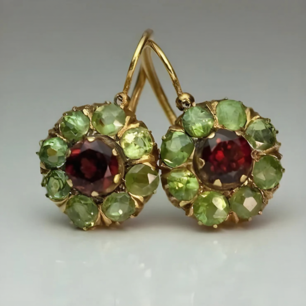 Ein Farbspiel wie aus einem alten Garten: sattes Rot umarmt von frischem Grün. Diese Ohrringe versprühen historische Romantik und florale Anmut.