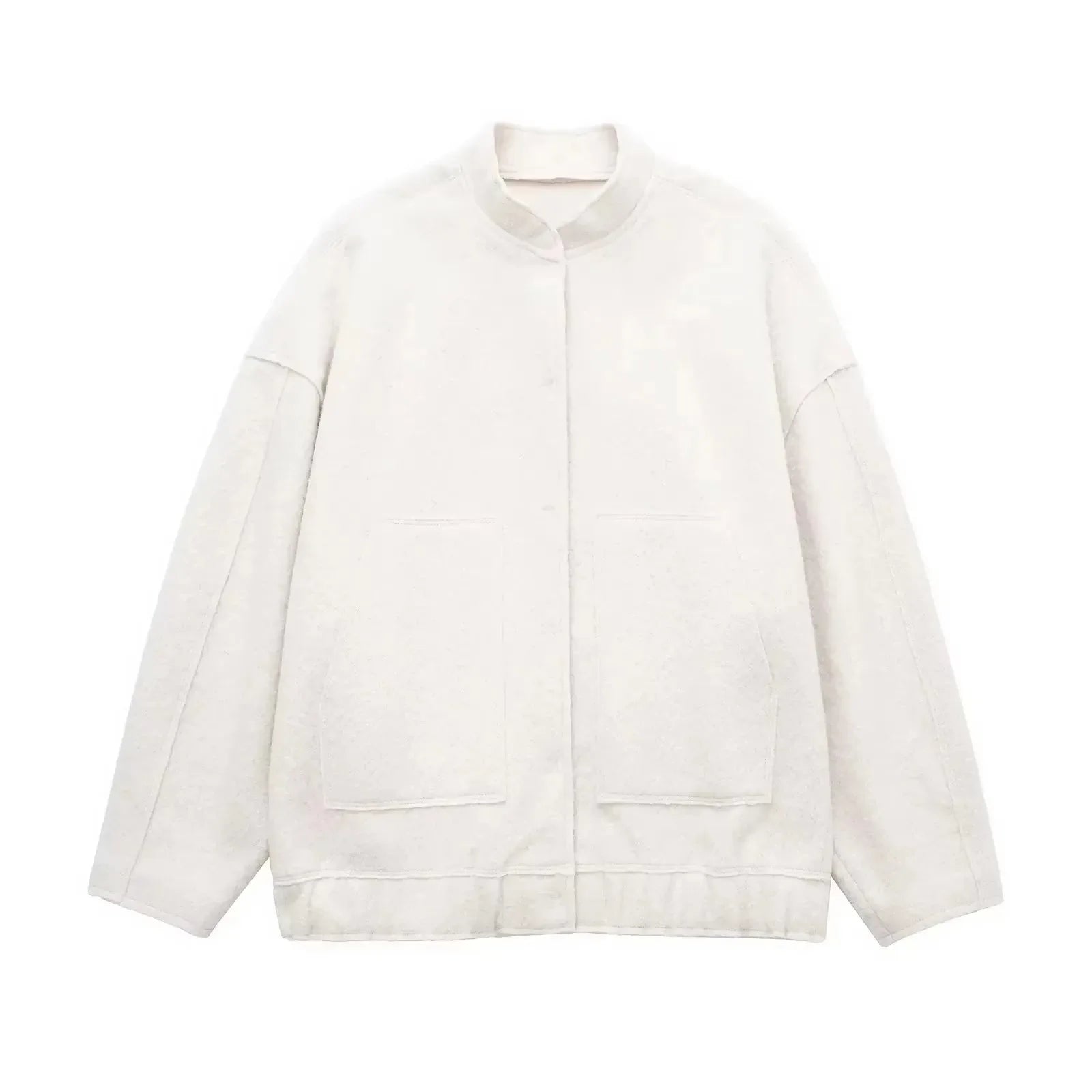 Diese Street-Jacke mixt minimalistischen Chic mit cozy Textur. Der weiche Bouclé/Wollmix legt sich lässig über Blusen, Knit & Hoodies, während Druckknöpfe, Bandkragen und der entspannte Fit sie alltagstauglich machen – perfekt zu Denim, Anzughose oder Satinskirt & Boots.