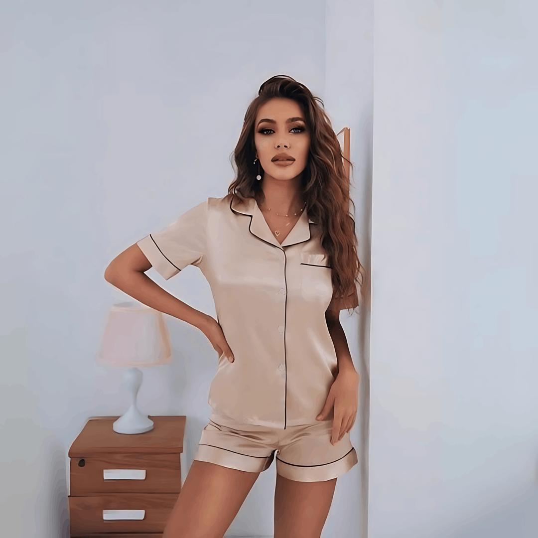 Das aus hochwertigem Seidensatin gefertigte Mika-Set sorgt für eine ununterbrochene Nacht. Das atmungsaktive Material hält Sie in Sommernächten kühl und in kalten Winternächten warm und verspricht das ganze Jahr über erholsamen Schlaf.