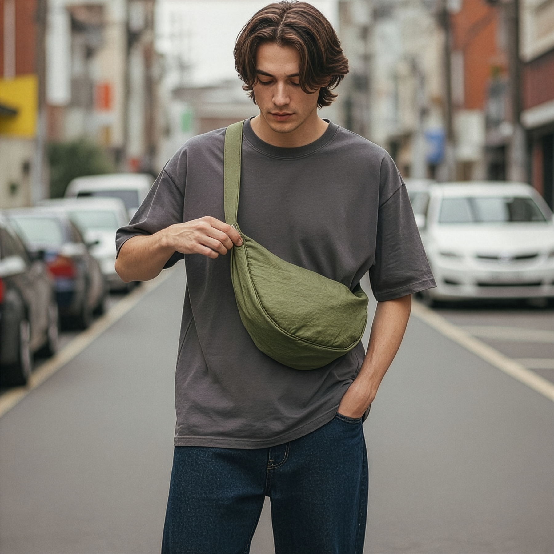 Dschungel ist die Perfektion der Schlichtheit – kompakt, vielseitig und für den täglichen Gebrauch gemacht. Gefertigt aus ultraleichtem, wasserabweisendem Nylon, transportiert sie genau das, was Sie brauchen, ohne zu beschweren. Ein geräumiges Hauptfach mit zwei kleineren Innenfächern hält Ihre wichtigsten Dinge ordentlich organisiert, während der verstellbare Riemen es ermöglicht, die Tasche bequem als Crossbody oder über der Schulter zu tragen.