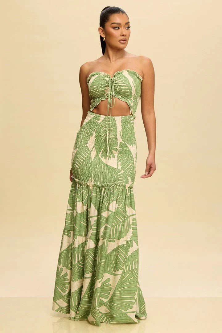 Mit dem Naysa-Kleid ziehen Sie in dieser Saison alle Blicke auf sich – ein trägerloses, figurbetontes Maxikleid, das Ihre mutige, tropische Energie unterstreicht. Mit seinem gerafften Oberteil mit Schnür Details und einer breiten, hohen Taille betont dieses Kleid Ihre Figur und bietet Ihnen gleichzeitig Bewegungsfreiheit. Der ausgestellte Saum und der durchgehende Palmblatt Druck machen es zu einem Sommer-Must-have, perfekt für Strand Dinner, Festivals oder warme Stadt Nächte. Erhältlich in Grün oder Blau, schmeichelt es jeder Figur mit Komfort und Lebendigkeit.