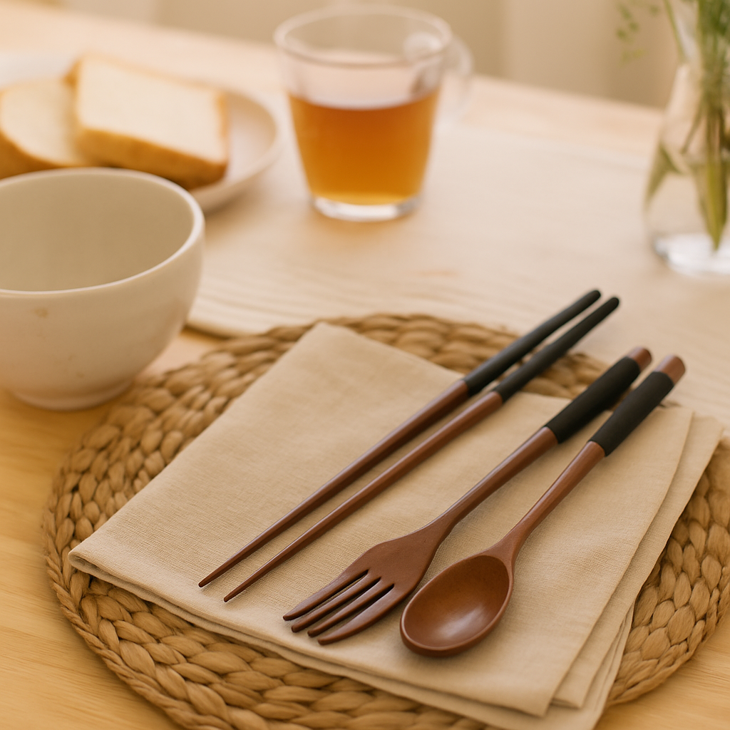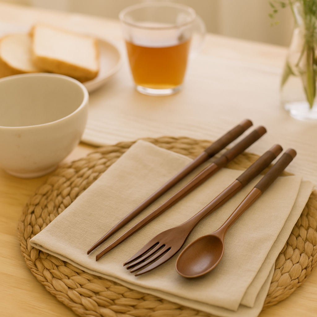 Handgefertigtes Holzset: Enthält Essstäbchen, Gabel und Löffel für vielseitige Mahlzeiten.