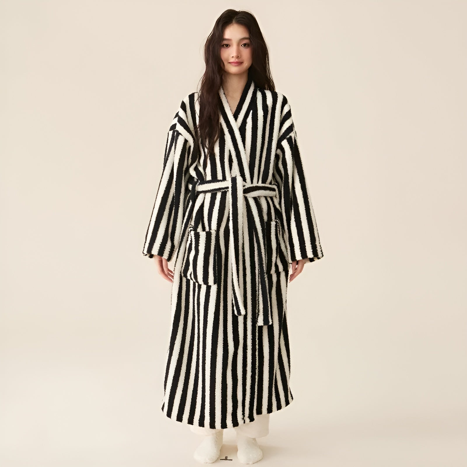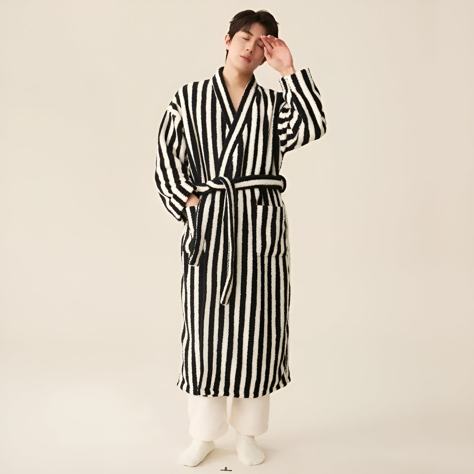 Erleben Sie die perfekte Kombination aus Wärme und Stil mit dem PlushWrap Robe, Ihrem idealen Begleiter für gemütliche Winterabende. Dieses weiche, gestreifte Bademantel-Pyjama-Set ist für Paare gemacht, die Wert auf Komfort und modernes Design legen. Egal, ob Sie gemeinsam einen Film schauen oder den Morgen entspannt beginnen möchten – das PlushWrap Robe-Set bringt Wärme und Harmonie in Ihren Alltag.