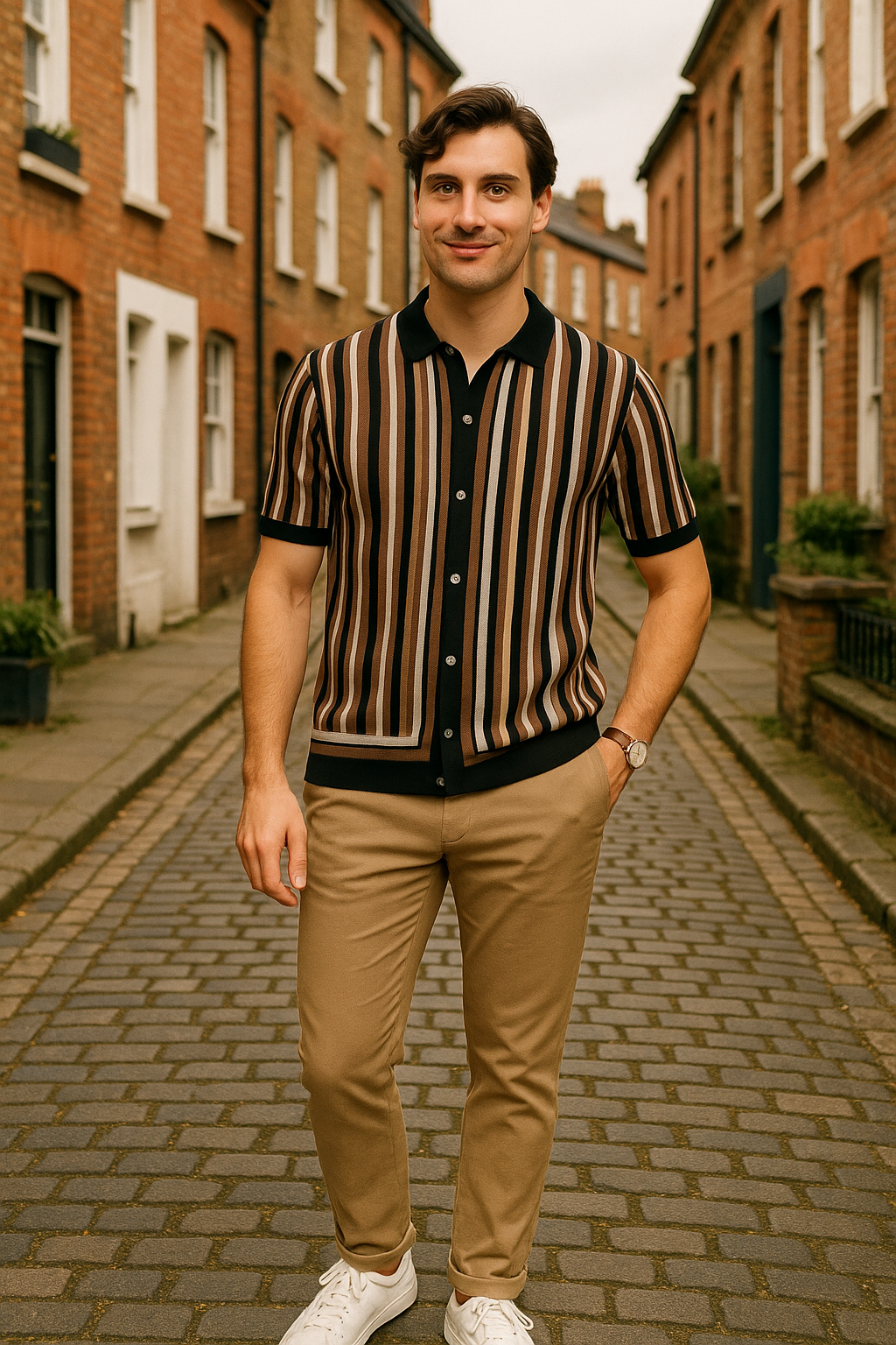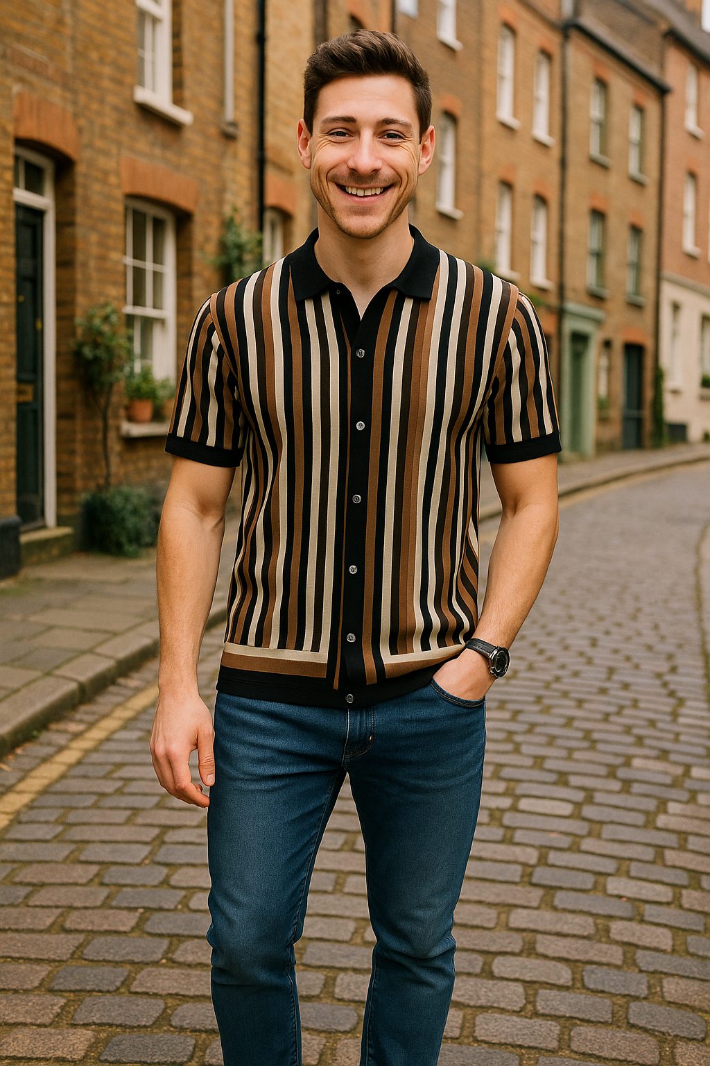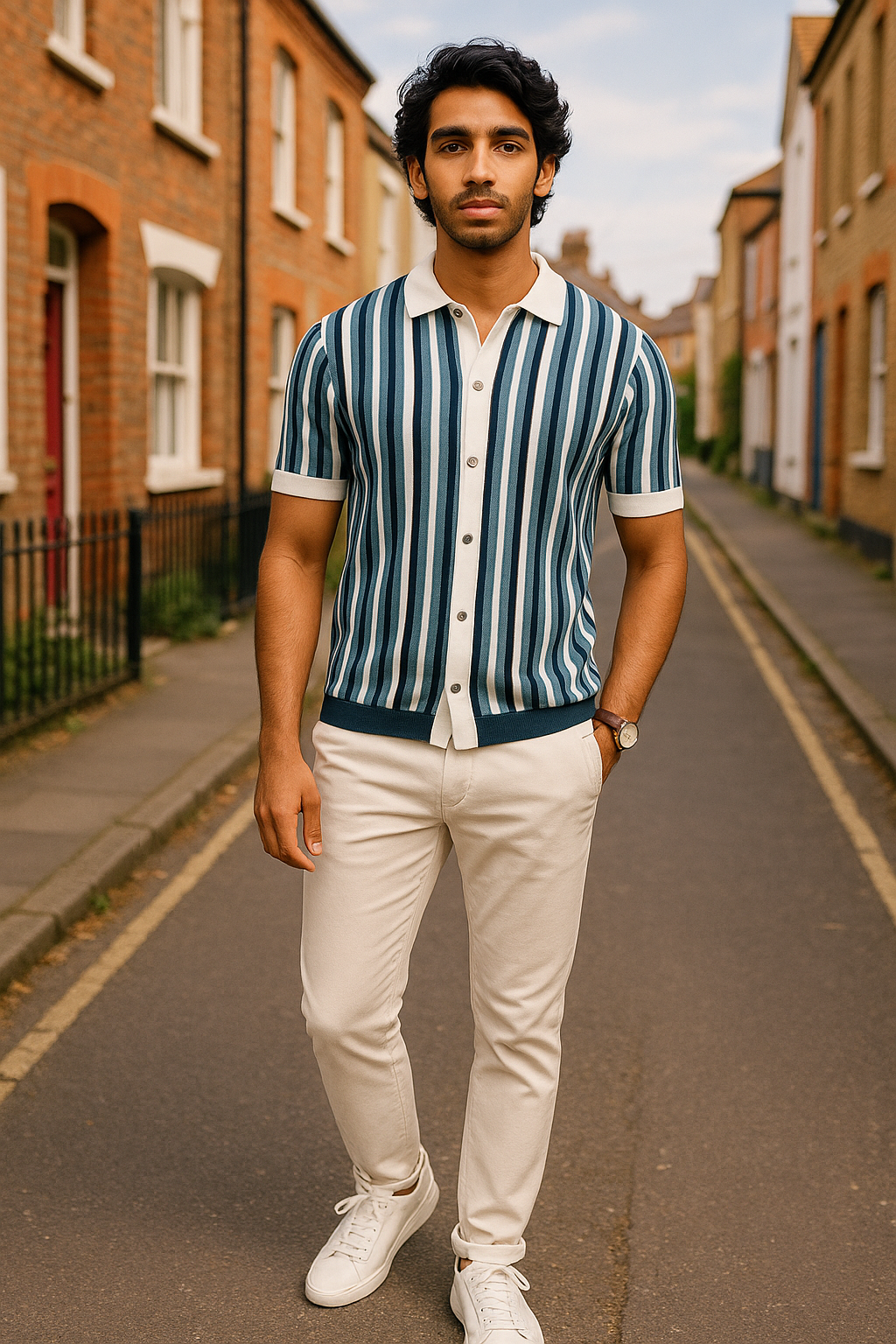 Der weiche, atmungsaktive Stoff sorgt für höchsten Tragekomfort, während die vertikalen Streifen optisch strecken und dem Look eine sportlich-elegante Note verleihen. Die Knopfleiste am Kragen rundet das Design stilvoll ab.