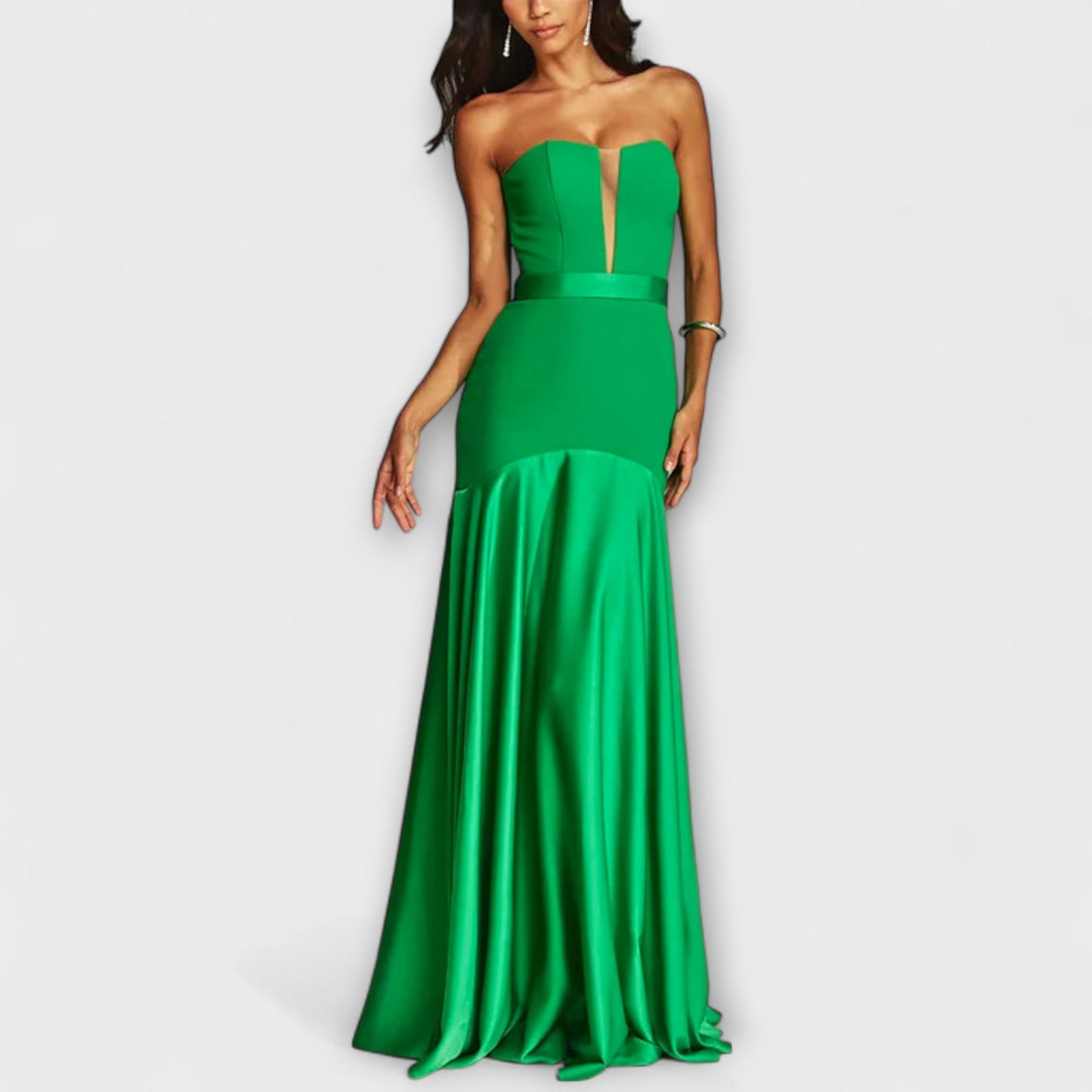 Mit Vadena tauchst du ein in die Magie eines Sommerabends – schulterfrei, fließend und verführerisch elegant. Der tiefe, transparente V-Ausschnitt bringt subtile Sinnlichkeit, während der glatte Stoff in bodenlanger Silhouette mit jeder Bewegung mitschwingt. Ein Kleid, das nicht nur den Moment verschönert, sondern ihn unvergesslich macht.
